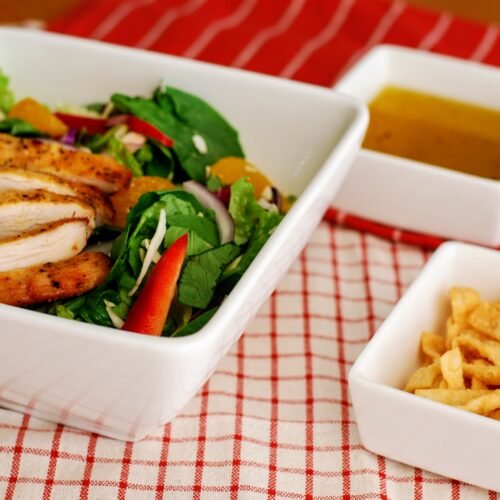 - Serve topped with chicken, dressing, mandarin orange slices, wonton strips, and a sprinkling of sesame seeds.