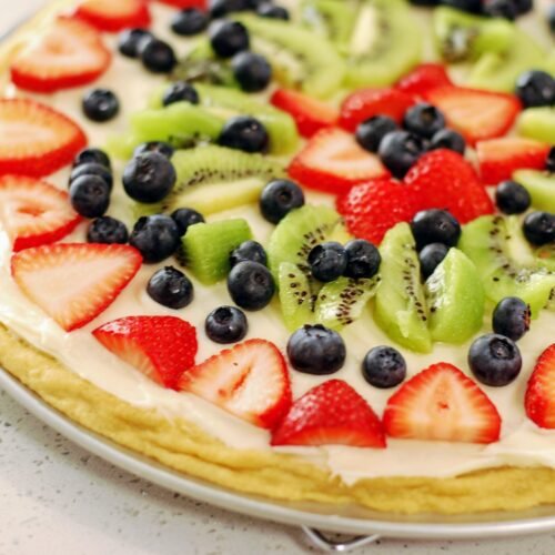 Fruit pizza is best served the day you make it because that’s when the cookie crust is at its crunchiest. If you need to make it ahead, bake the cookie and make the frosting in advance, then assemble right before serving.